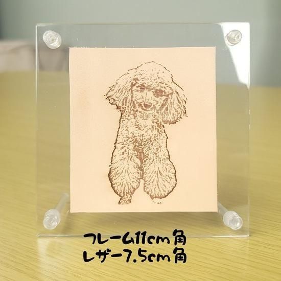 かわいいプードルのイラストが彫刻されたレザーシートをフォトフレームに入れたレザーアートフレームです