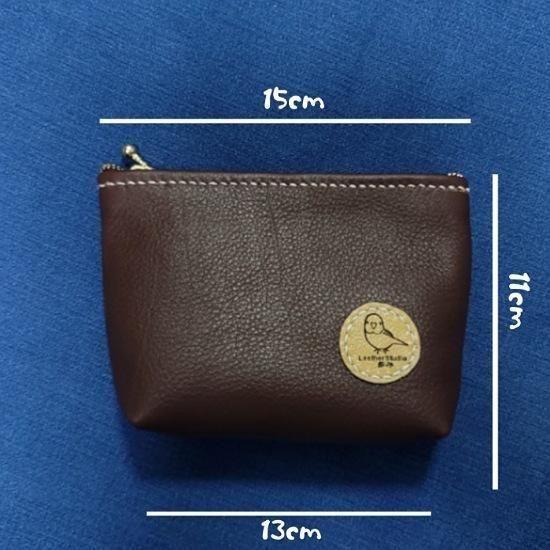 セキセイインコのマークタグがあしらわれたこの本革ポーチは、どんなファッションにもぴったりマッチします。丈夫な本革製なので、長くご愛用いただけます。手触りの良さと高級感が魅力のアイテムです。マチがしっかりとしているので、小物やメイクアイテムをたっぷり収納することができ、持ち運びにも便利です。